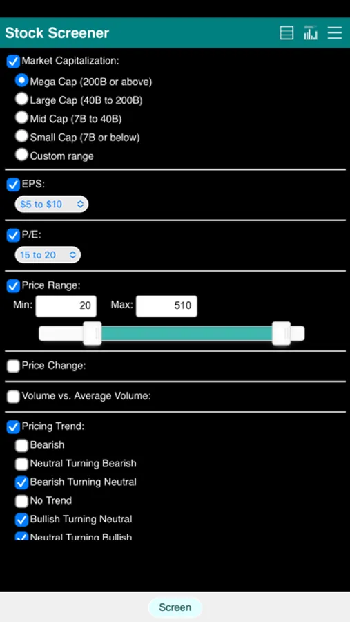 The Stock Market Screener App finds securities with unique trading opportunities based on key fundamental and technical characteristics as well as chart patterns.