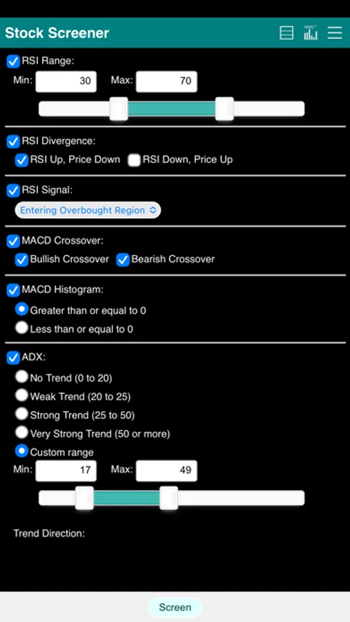 Technical screening criteria include pricing trend, moving average stack up, RSI range, RSI divergences detection, RSI overbought and oversold signals, MACD crossover detection, MACD Histogram signals, ADX strength and ADX trend direction.