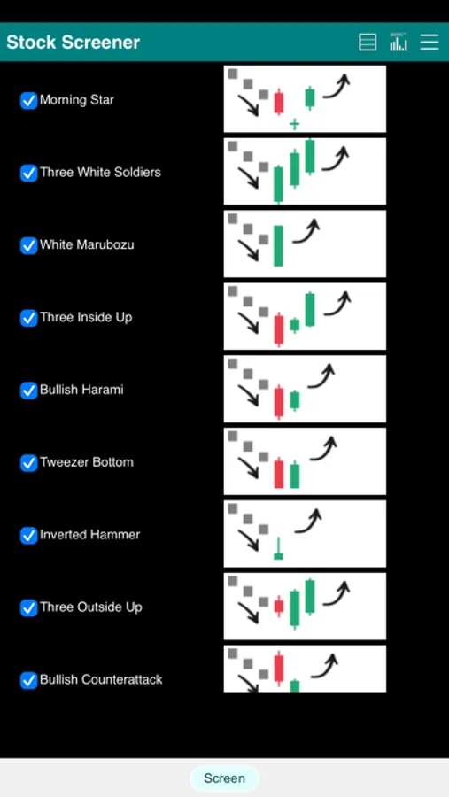 Chart patterns screening currently supports searching for the following 31 commonly used candlestick patterns: Hammer, Piercing Line, Bullish Engulfing, Morning Star, Three White Soldiers, White Marubozu, Three Inside Up, Bullish Harami, Tweezer Bottom, Inverted Hammer, Three Outside Up, Bullish Counterattack, Rising Three Methods, Upside Tasuki Gap, Rising Window, Hanging Man, Dark Cloud Cover, Bearish Engulfing, Evening Star, Three Black Crows, Black Marubozu, Three Inside Down, Bearish Harami, Tweezer Top, Shooting Star, Three Outside Down, Bearish Counterattack, Falling Three Methods, Downside Tasuki Gap, Falling Window and High Wave.