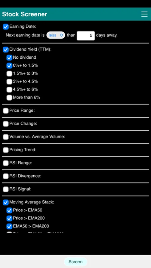 .Fundamental screening criteria: Market Caps, EPS, P/E, Price range, dividend yield, earning report date.