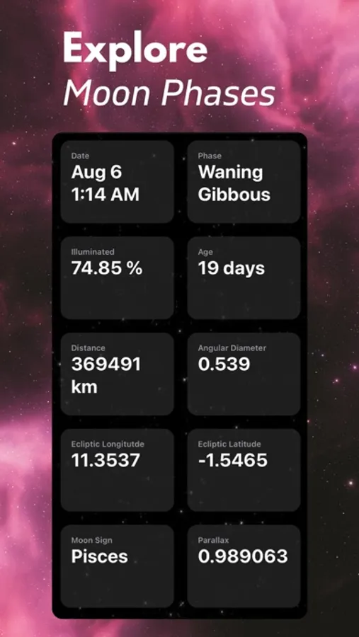 Age, Distance & Diameter: Dive deeper into astronomical details. Find out the moon's age, distance from Earth, and angular diameter on any specific day. Impress your friends with your newfound lunar insights.