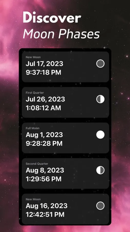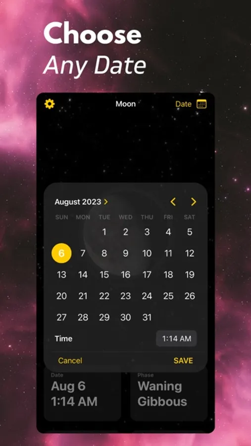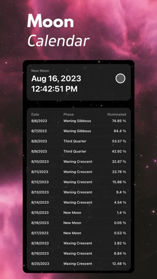 Explore Moon Phases: Instantly discover the current moon phase or choose any date to see the moon's appearance, from a delicate crescent to a full, radiant orb. Delve into the past or gaze into the future to witness the moon's graceful dance through time.