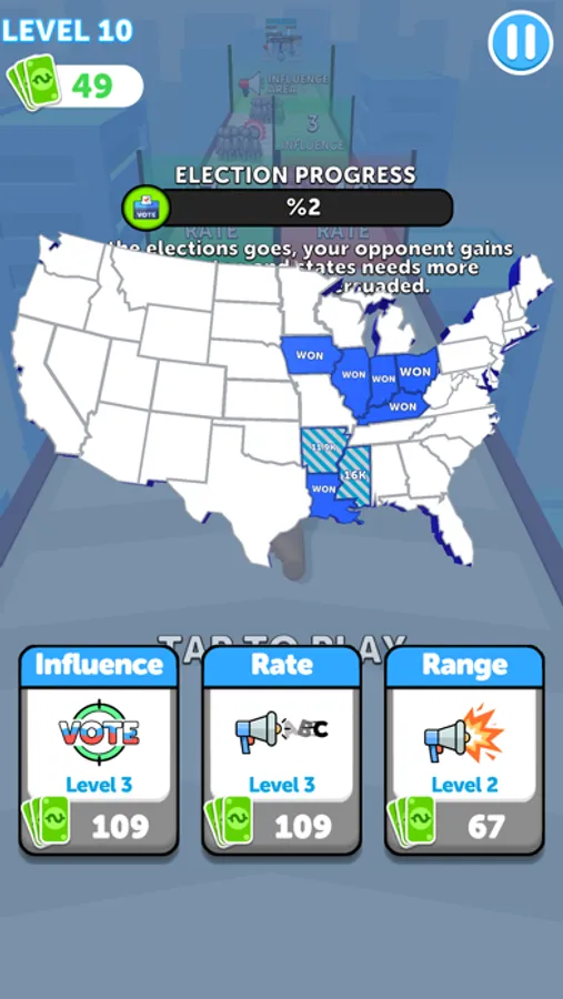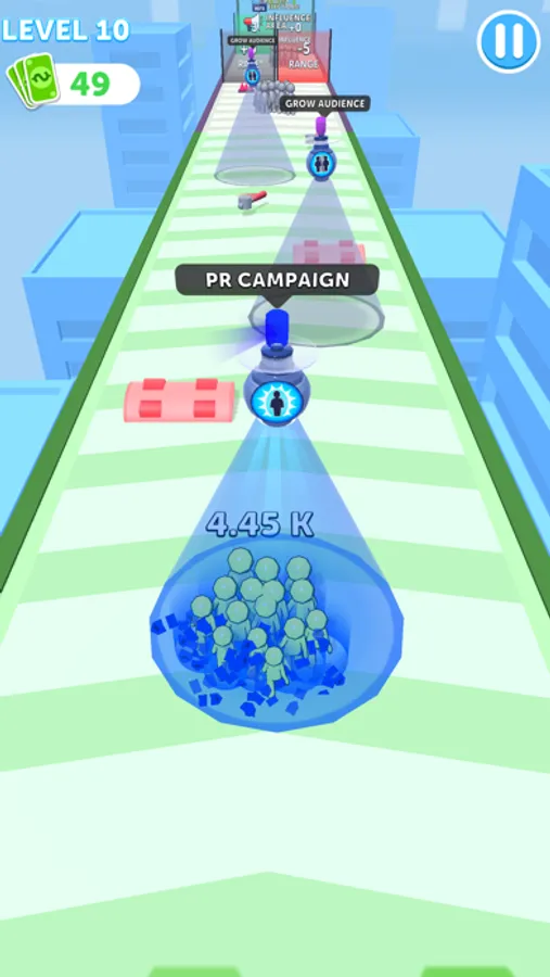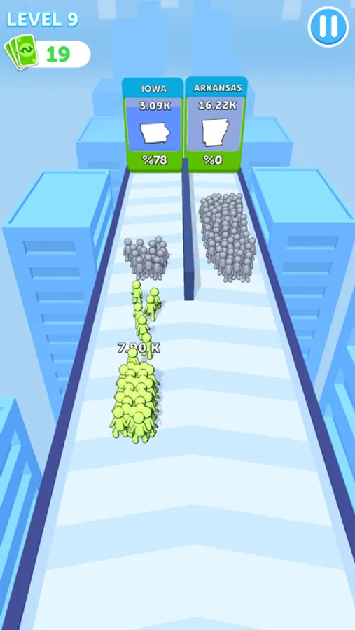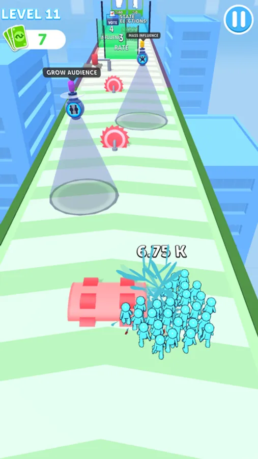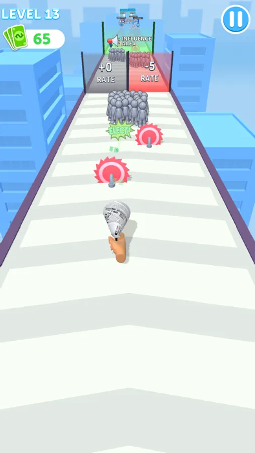 Are you ready to present your election promises to the people and influence them as the election approaches? Make your voice heard by the public and ensure that they walk this path with you. While doing this, you can use your extra boosters to increase the number of votes. The people who vote for you will follow you, and together you will enter the influence area. Here, you can increase the number of people, but be careful of obstacles because you don't want to see the opposite effect! If you want to win the elections, play well to ensure that the population you last gathered is large!