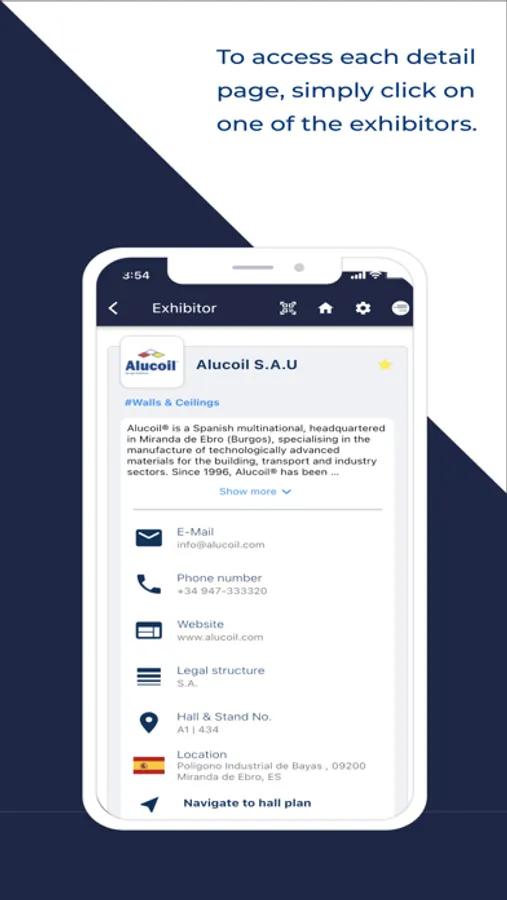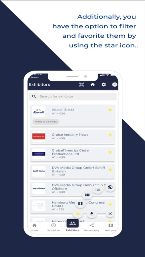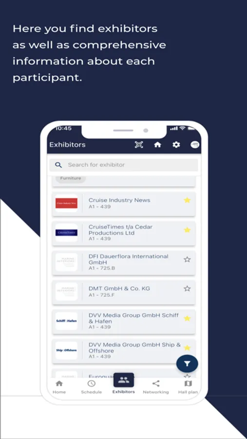 Within the exhibitor list, you'll gain insight into all participating companies, including their contact information, and effortlessly find their booths by utilizing the hall map.