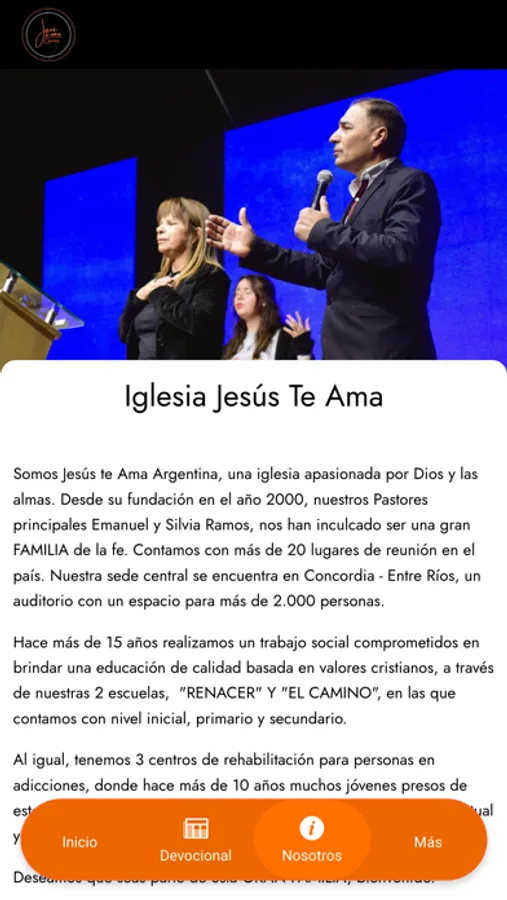 Somos Jesús te Ama Argentina, una iglesia apasionada por Dios y las almas. Desde su fundación en el año 2000, nuestros Pastores principales Emanuel y Silvia Ramos, nos han inculcado ser una gran FAMILIA de la fe. Contamos con más de 20 lugares de reunión en el país. Nuestra sede central se encuentra en Concordia - Entre Ríos, un auditorio con un espacio para más de 2.000 personas.