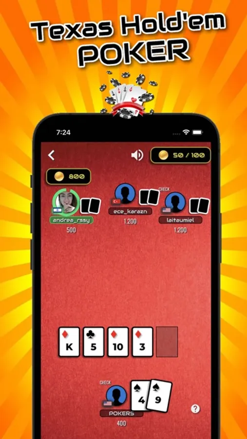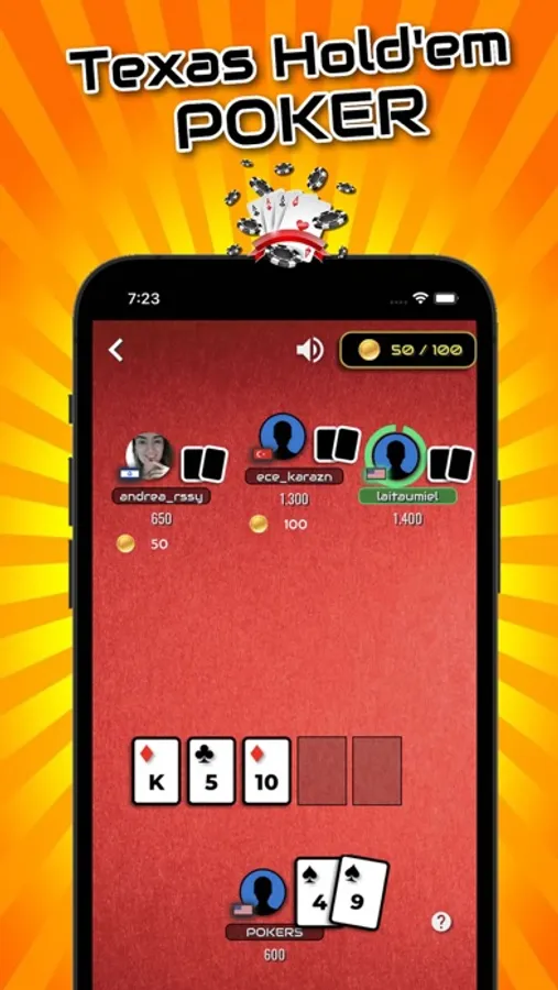 TEXAS HOLDEM TOURNAMENTS: Play poker in 5 or 9-person table rooms based on how many chips you have. Enjoy playing your favourite card game against opponents and get on the leaderboard with player and country based poker rankings.