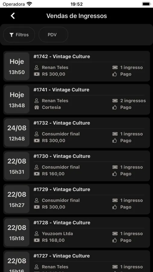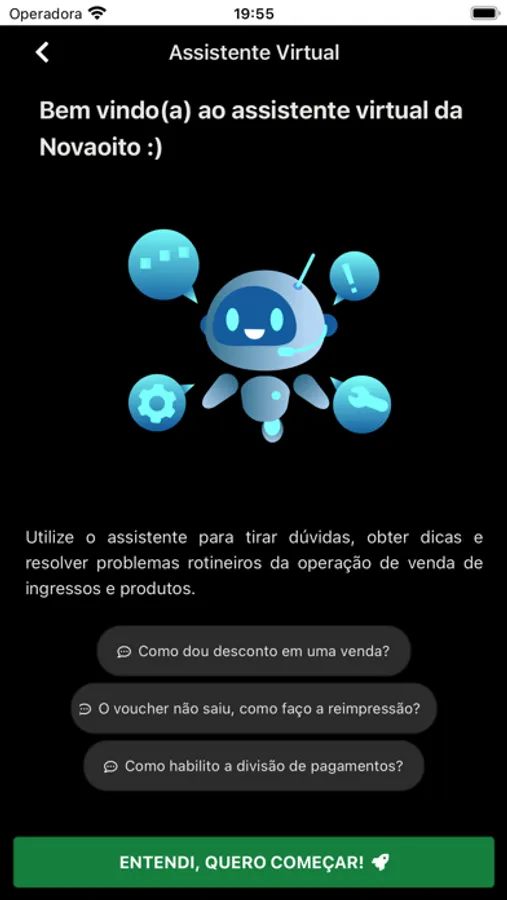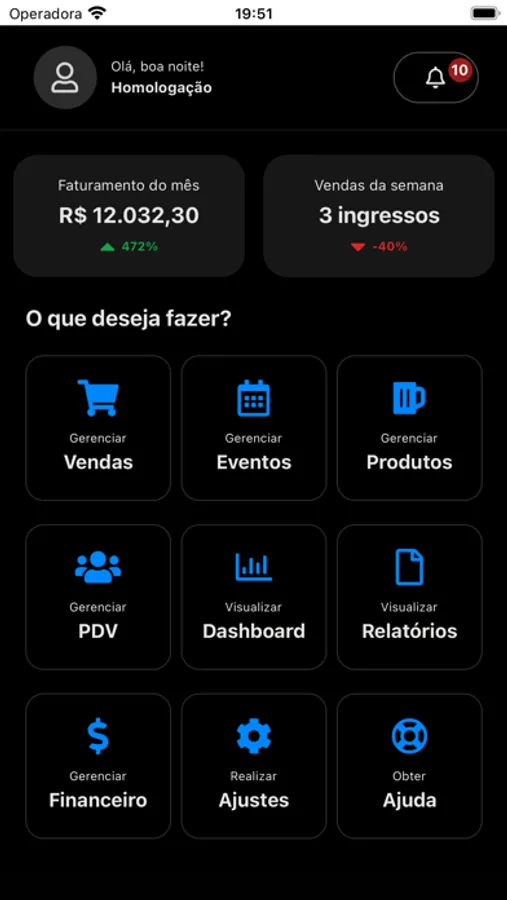Aplicativo para gestão da conta na plataforma Novaoito Tickets, entre os principais recursos, estão: