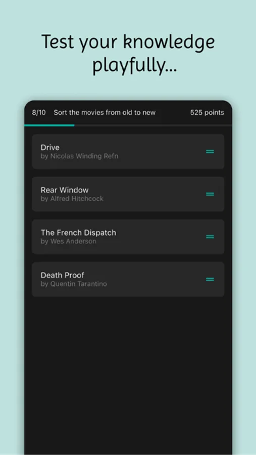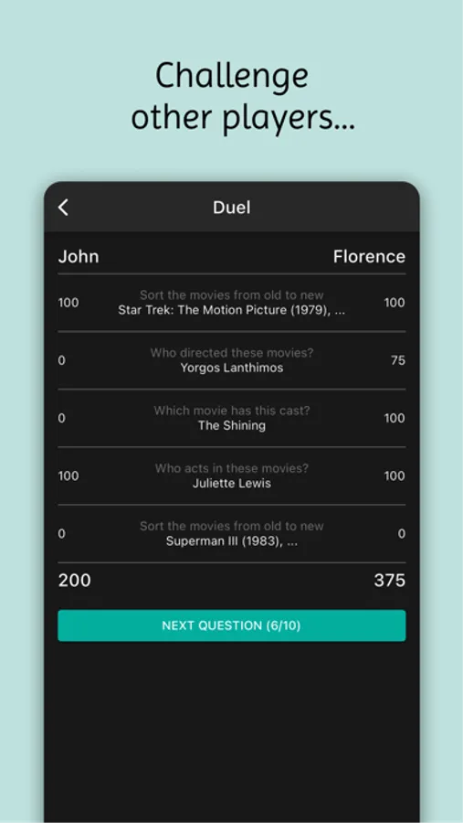 The trivia games in the app are automatically generated from data in a proprietary movie database. This results in (almost) infinite quiz questions. Examples: