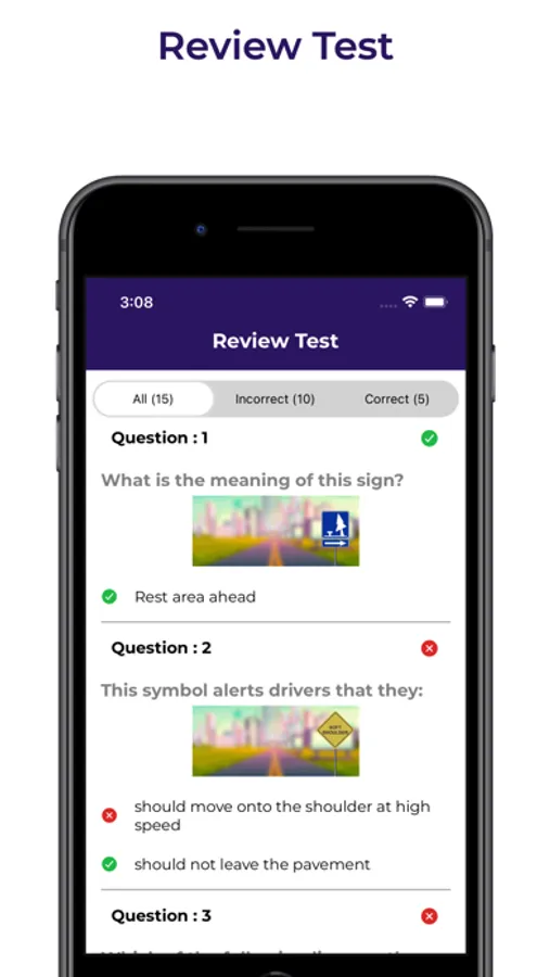 The app includes a Mock Test with random questions and a Practice Test with a variety of CT DMV Permit Test practice questions. These questions are based on the Connecticut Department of Motor Vehicles handbook.
