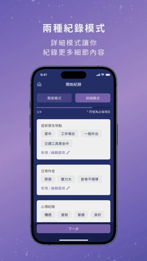 2. 客製化選項、排序:提供兩種不同紀錄模式,讓你隨意選擇紀錄的細節程度,且提供客製化新增選項及移動排序設計,可打造符合個人需求的紀錄方式。