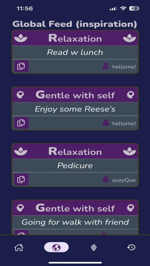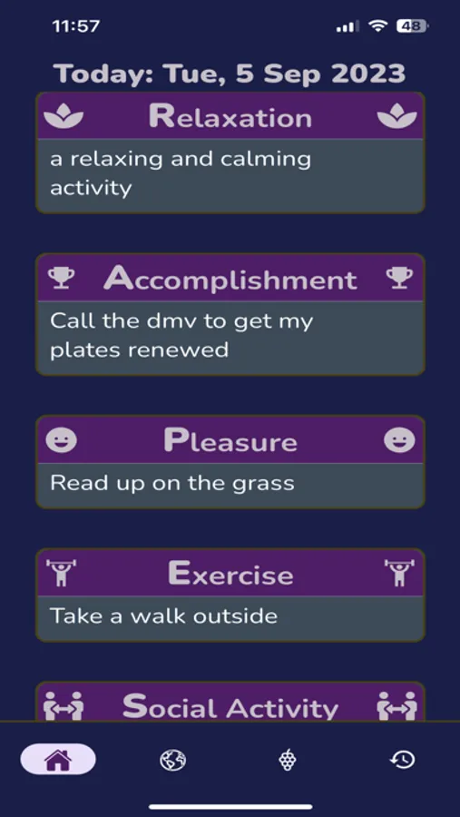 You keep track every day of your planned activities and can optionally share an activity you particularly enjoyed with other users. You can also see what others have done and get ideas for your own GRAPES© practice in the Global Feed.