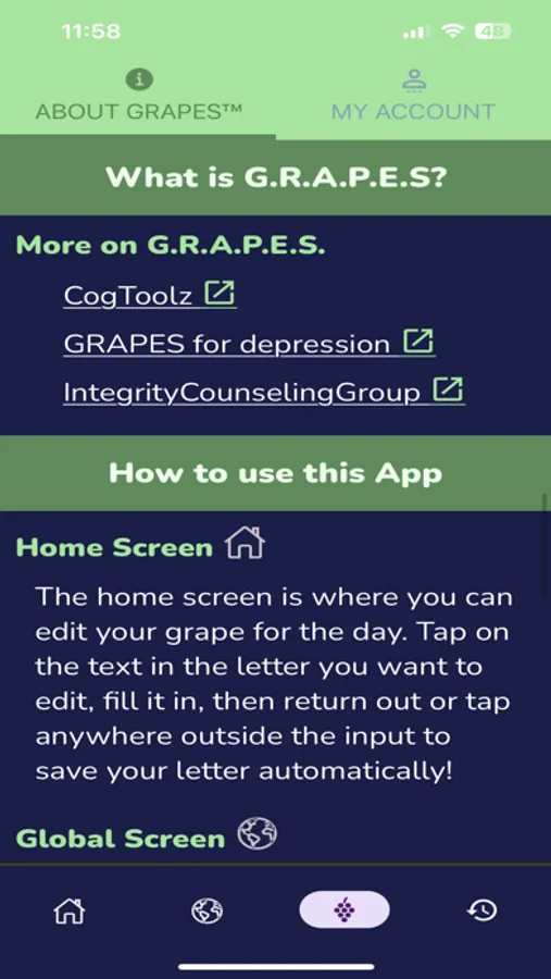 With this app, each day you'll choose a simple activity from each of the different categories. GRAPES© is great for anyone, but particularly can help with those who experience anxiety and depression. It can help you to feel more balanced, improve your mood and aid in tracking your progress and growth over time. Keep it saved for you to share with your therapist, coach, or another mental health professional.