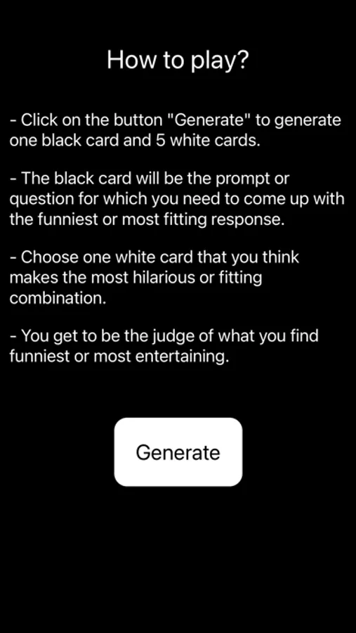 It's a party game known for its dark and often offensive humor, and it is intended for mature audiences. It is played with a set of black cards containing fill-in-the-blank phrases and a set of white cards with various words or phrases. Players take turns being the "Card Czar," who reads a black card with a fill-in-the-blank statement, and the other players choose their funniest or most fitting white card to complete the sentence.