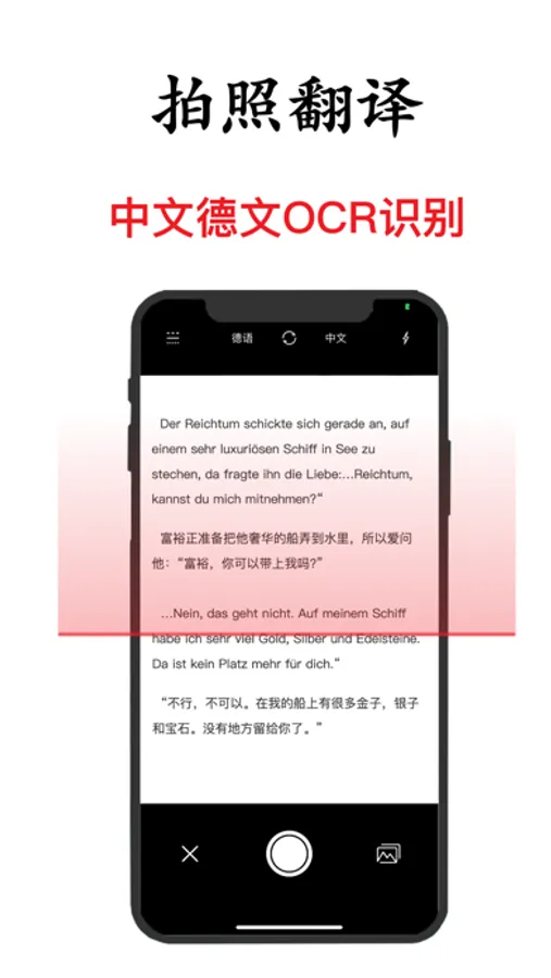 超级精准的ocr图片识别,支持手机拍照及相册中中文与德文照片,轻轻一按翻译结果就显示,绝对是出行旅行识别路标菜单的必备工具。
