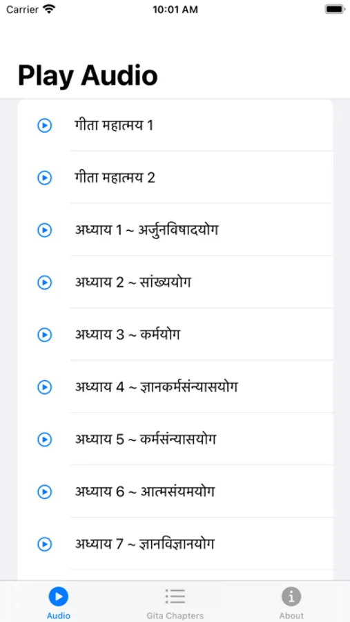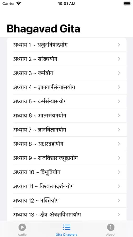 Gita Gyan app list all chapters of Bhagavad Gita. It is a conversation between Arjun and Lord Krishna on the battlefield. It guide relates to dharma of a person. The app also have a audio version of all chapters.