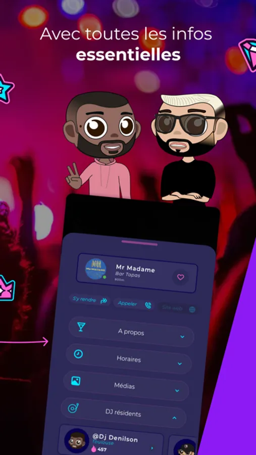 Personnalise ta map en fonction de tes styles de musiques favoris, de ta tranche d’âge ou encore du type d’établissement recherché et trouve les endroits qui se marient parfaitement à tes envies.