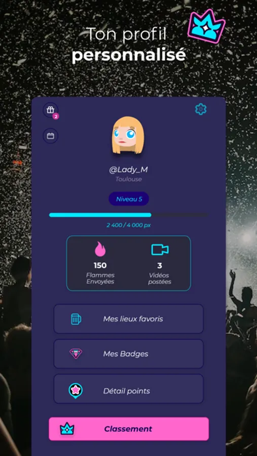 Avec notre gamification deviens un acteur reconnu de la vie nocturne. Partage tes meilleures vidéos, envoies des flammes en direct et grimpe dans le classement des fêtards les plus en vogue du moment. Deviens une légende de Pinkin !