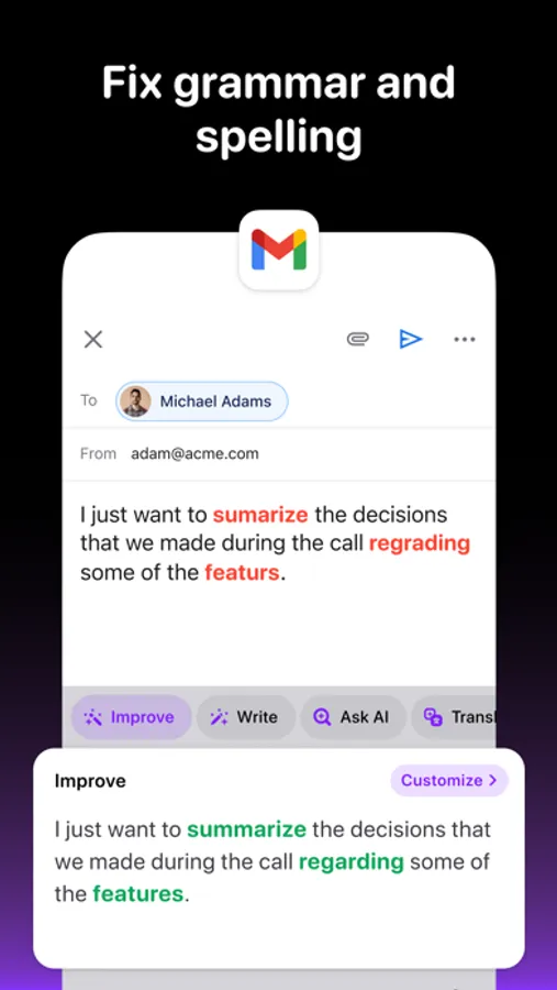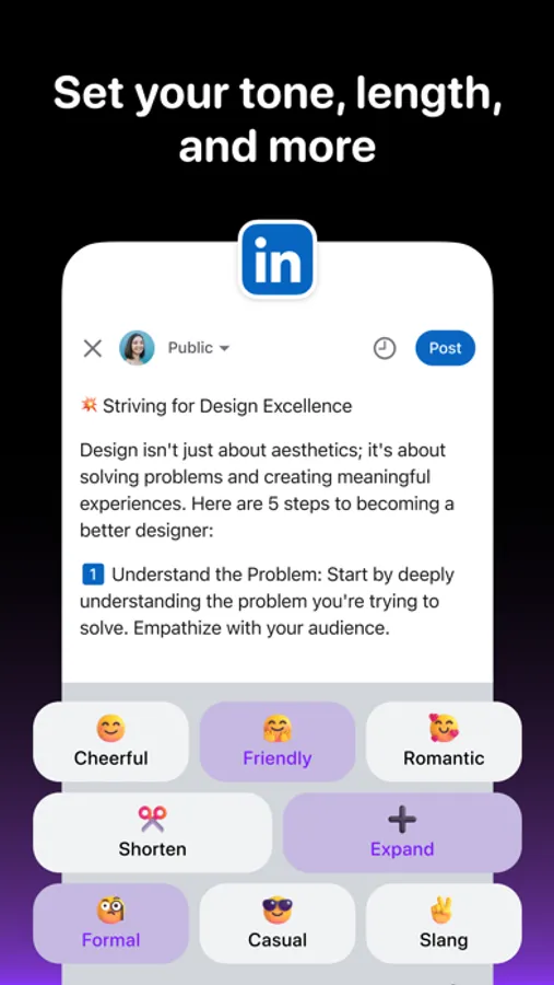 • Effortlessly adjust your text's tone (cheerful, formal, casual, romantic and more) and sprinkle in extra emojis to add personality and expression to your messages.