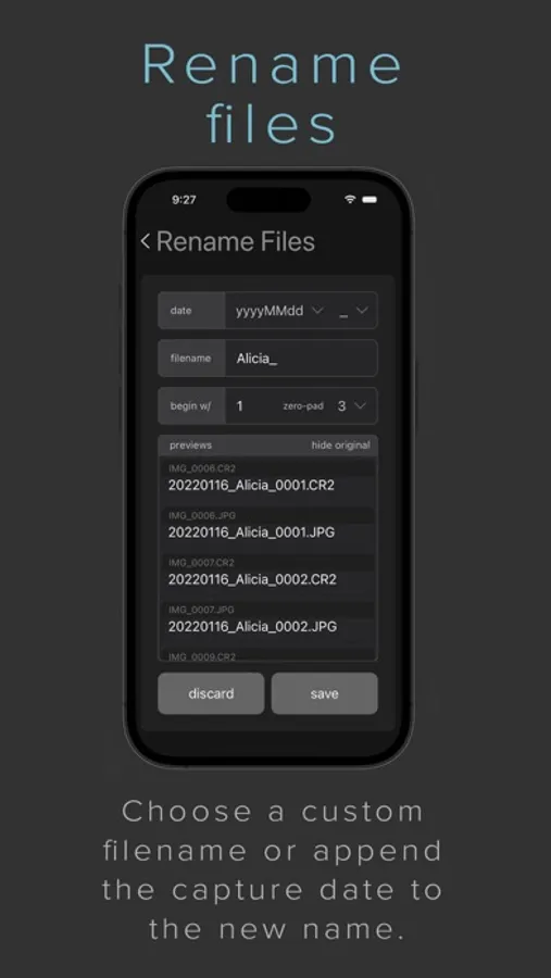 • Rename files with a custom text entry (My_Trip, California, etc)