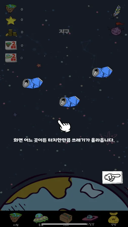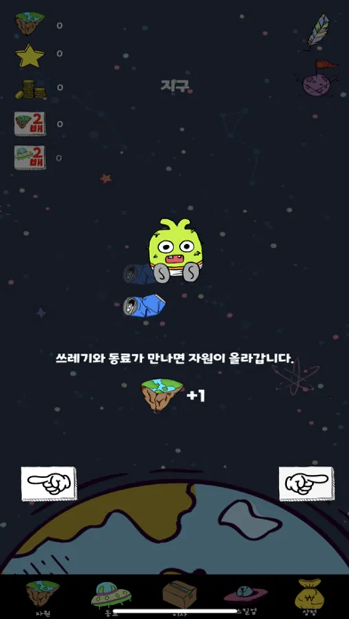 *** 행성에서 쏟아져 나오는 쓰레기들을 모아보세요. 쓰레기는 자원이 되고, 자원으로 동료를 영입할 수 있습니다!