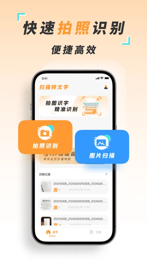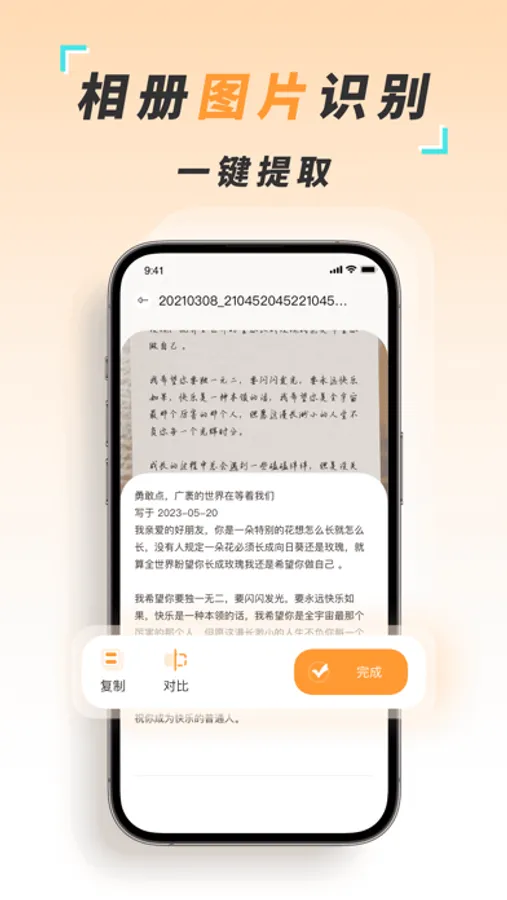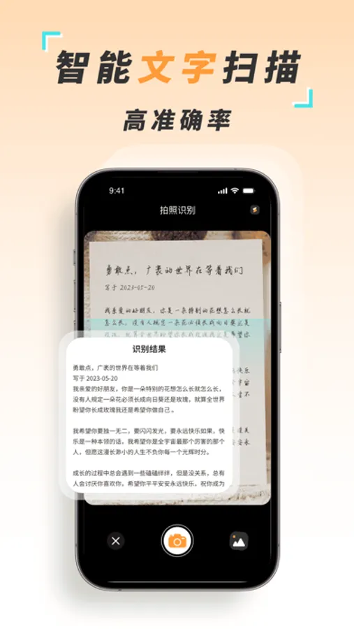 【快速识别】智能OCR文字识别技术,将拍摄照片中的文字快速转换为文本内容,你可以随意修改、复制、导出、分享等。