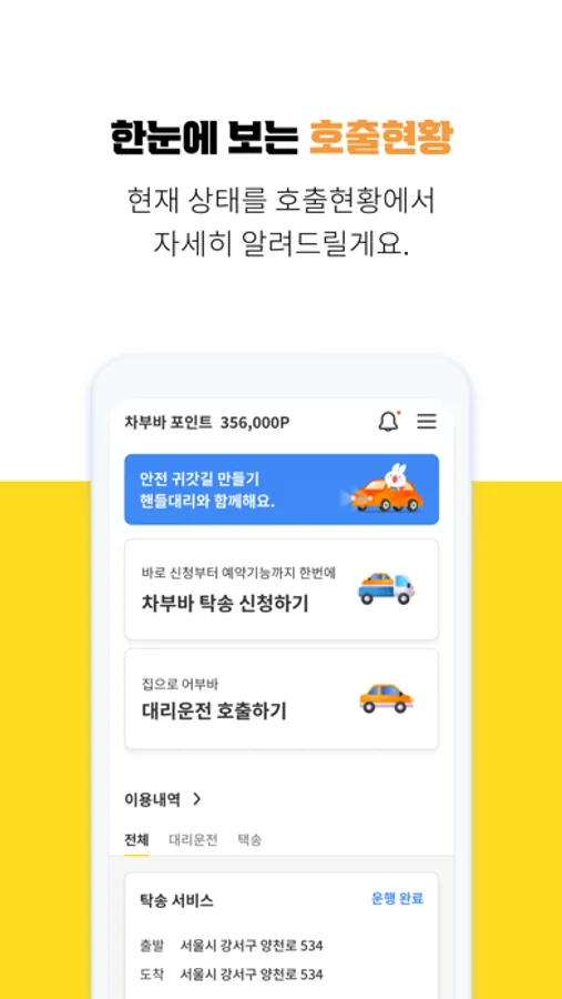 4) 실시간 호출현황 보기: 자신과 대신 불러준 대리운전 기사 호출 현황을 접수부터 운행상황까지 한눈에 볼 수 있습니다.