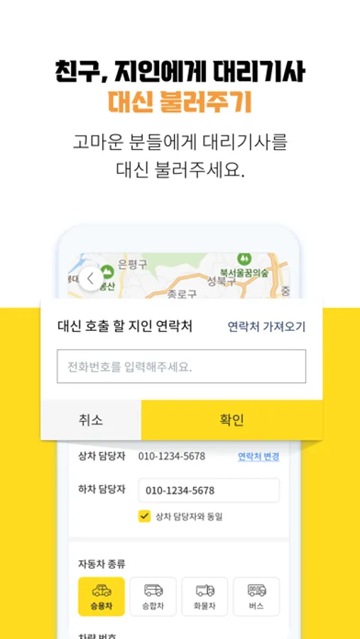 2) 대신불러주기: 친구나 지인의 대리운전 기사를 대신 호출(결제 포함)하는 기능을 제공합니다. 동시에 여러 건을 대신 불러줄 수 있기에 술자리에서 음주운전을 막아주는 멋진 사람이 될 수 있습니다.