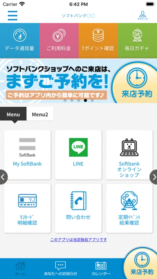 「キャンペーン」「店舗からのお知らせ」「各種WEB予約・申込」「問い合わせ一覧」「QRコードリーダー」など
