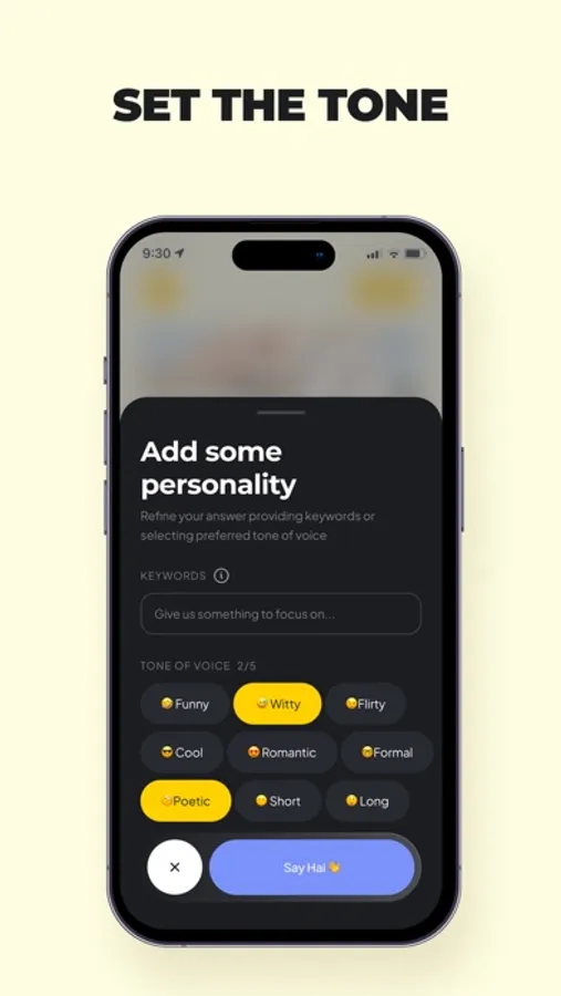 Powered by innovative language models, Hai produces custom responses and opening lines based on your or your match’s profile/bio or chat conversation. Select your desired tone - ‘Romantic’, ‘Fun’ or ‘Flirty’, and witness Hai generating the perfect conversation starter or response.