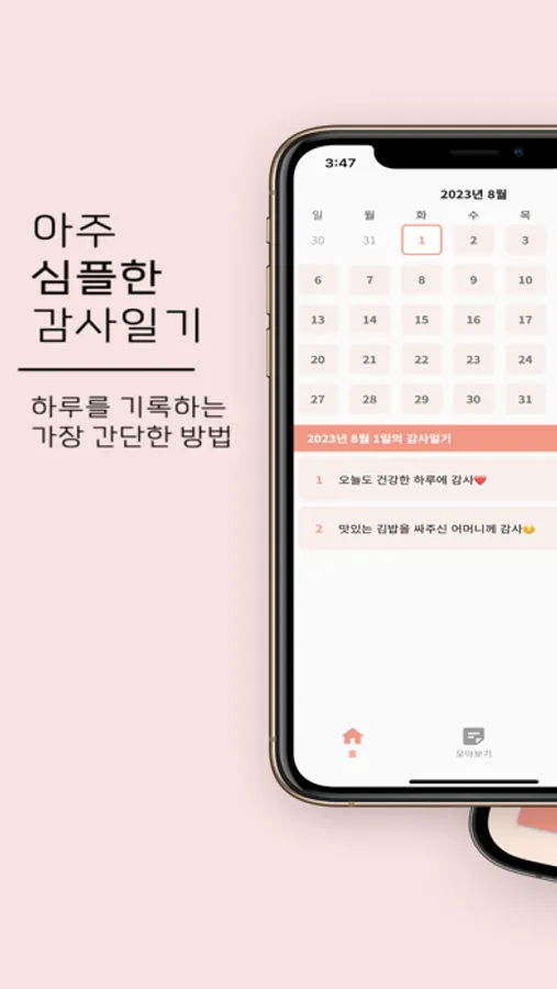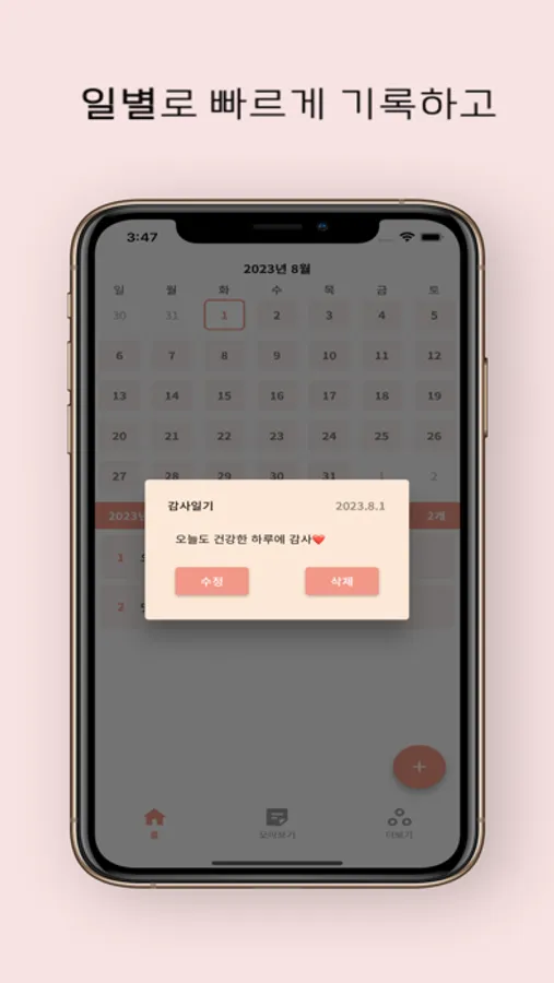 - 캘린더를 통해 날짜를 선택하고 우측 하단의 +버튼을 통해 오늘의 감사한 일을 기록할 수 있어요.