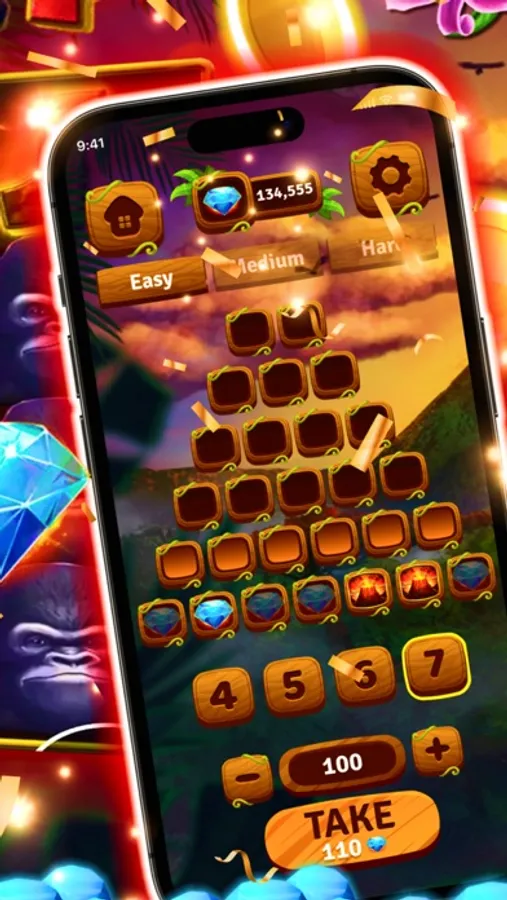 In "GemClimb," accompany a daring gorilla as you ascend a tower of blocks, each concealing a sparkling diamond or a perilous bomb. Navigate with care, choosing wisely to multiply your rewards with each step. Remember, one wrong move could spell the end of your climb, and you must decide whether to pocket your winnings or risk it all for greater treasures.