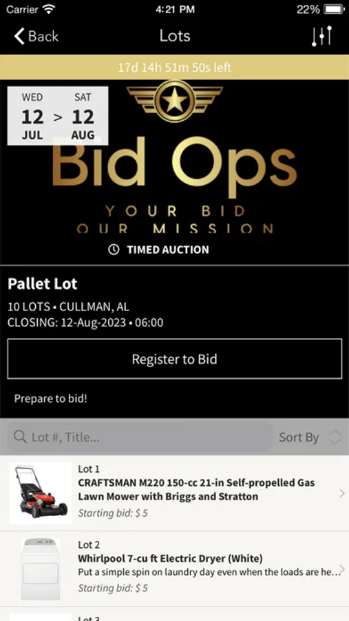 With the Bid Ops app, you can preview, watch and bid in our auctions from your mobile / tablet device. Participate in our sales while on-the-go and gain access to our following features: