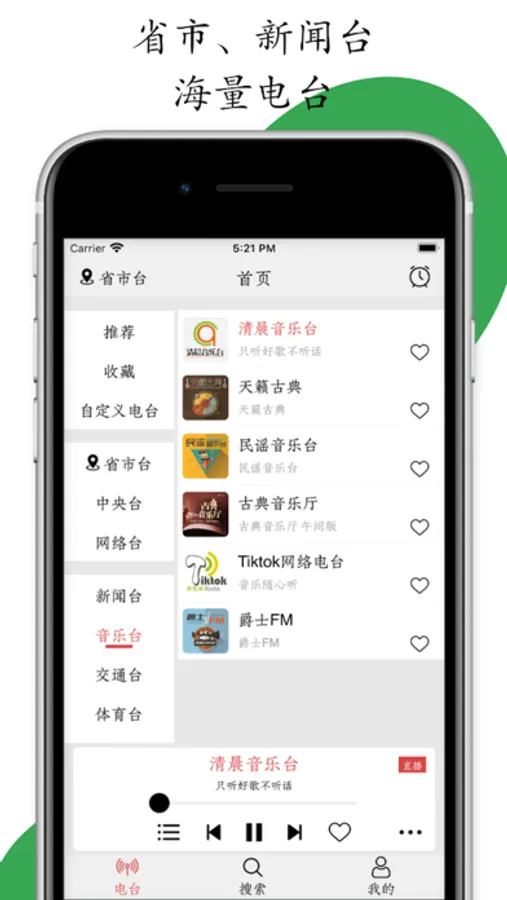 各省市电台:不仅包含有北上广深最热门的电台,还包含有每个省市最热门的电台,让您无论身在何处,都可以收听到最熟悉的家乡声音;