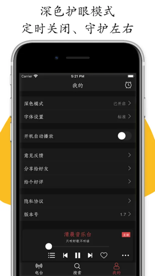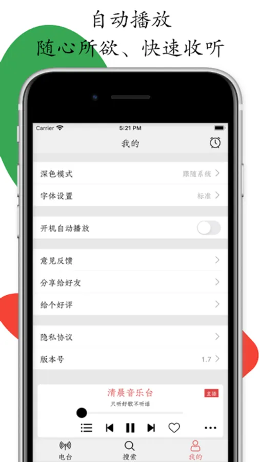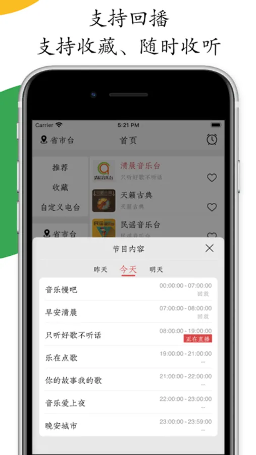 使用功能简单、易操作,包含收藏、开机播放、定时关闭等功能;
