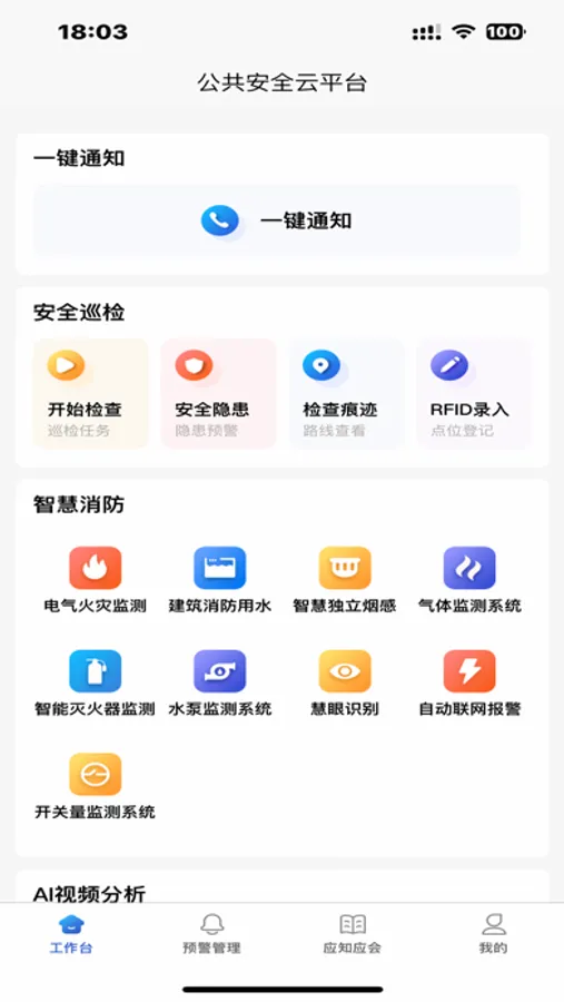 公共环境安全平台主要监管电气(电压、电流、剩余电流、电功率、电线温度等)、消防用水(消防水压、水位)、视频分析(烟火、消防通道占用、人员离岗、高空抛物、安全帽等)、气体监测(一氧化碳、二氧化碳、甲烷、液化气等)、自动联网报警(消防主机上云)、水泵监测、电梯安全(电动车上楼)、水域安全(防溺水)等,通过对数据的沉淀形成大数据,运用大数据分析研判、预知预警、辅助决策并指导实战,全面提升城市及企业安全。