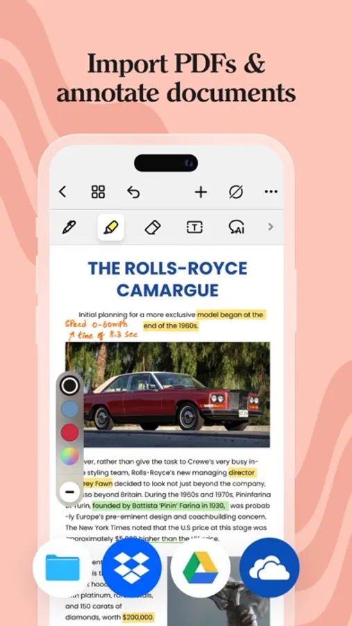 - Highlight, underline or annotate imported PDFs, documents and images with precision