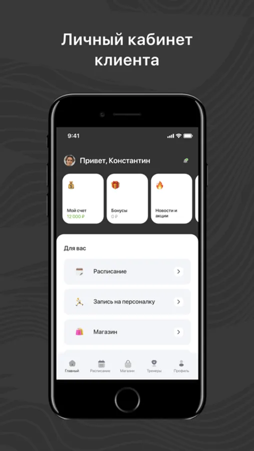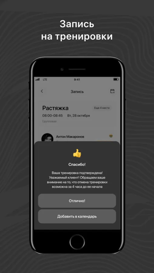 - записаться на тренировки: групповые и персональные, составить личное расписание
