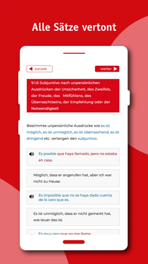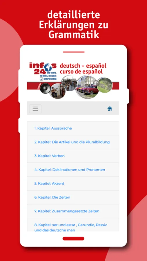 Der Grammatikteil ist kontrastiv. Soll heißen, dass die spezifischen Probleme, mit denen Deutsch Muttersprachler beim Erlernen der spanischen Sprache konfrontiert sind, berücksichtigt werden. 600 Seiten Grammatik mit mehreren Tausend vertonten Beispielsätzen mit Übersetzung, 4000 interaktiven Übungen, 120 Lieder, die speziell für diesen Kurs mit Musikern aus allen Ecken der spanisch sprechenden Welt komponiert wurden, mehrere Romane die bedeutsam sind für die Spanisch sprechende Welt mit Übersetzung und voll vertont, virtuelle Spaziergänge, Multimedia.