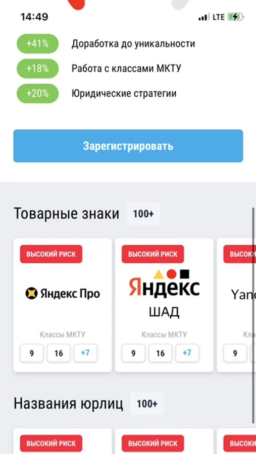Приложение осуществляет поиск по товарным знакам, юрлицам и доменам с подробной информацией по каждому из объектов. Базы обновляются ежедневно.