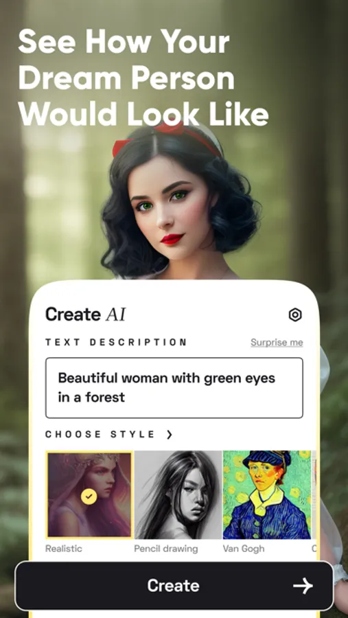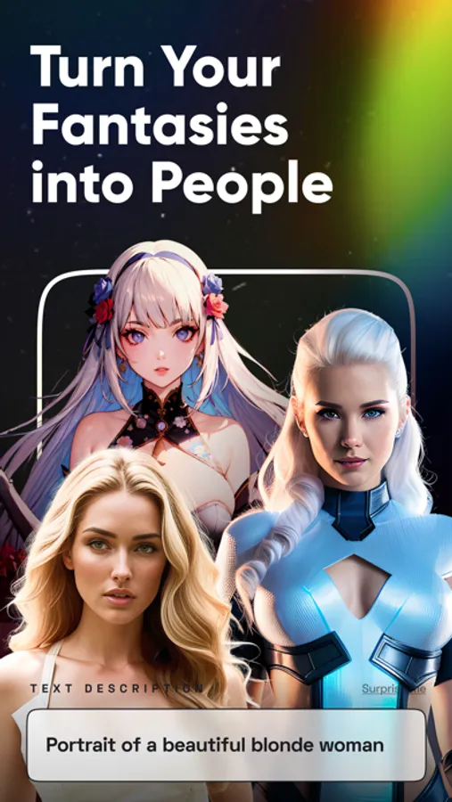 Choose gender, pick a style from hyper-realism to cyber-punk and fantasy, add details by specifying your prompt, and VOILA! – your dream person’s pic is ready!