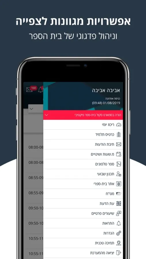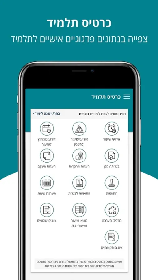 צפייה בכרטיס תלמיד, ציונים, אירועים בשיעור, שינויים והודעות מערכת שעות.