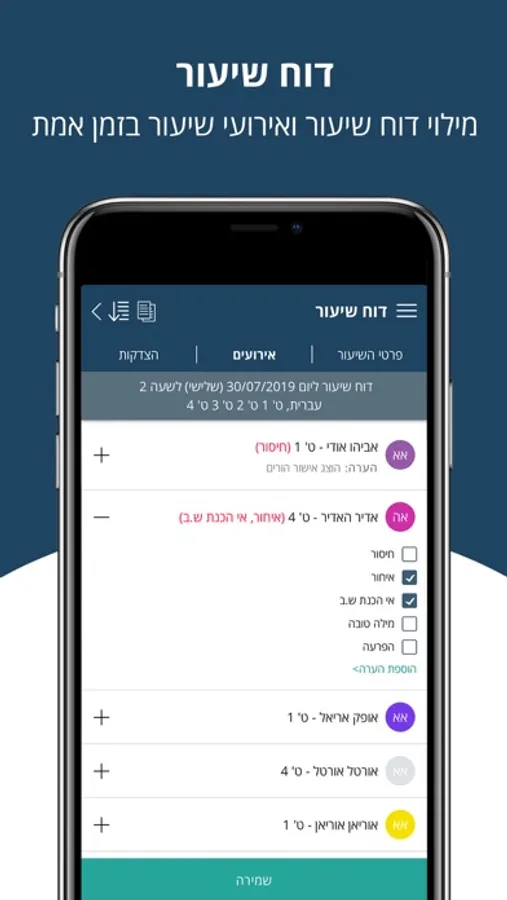 מילוי דוחות שיעור בזמן אמת ודיווח הצדקות לאירועים בשיעור.