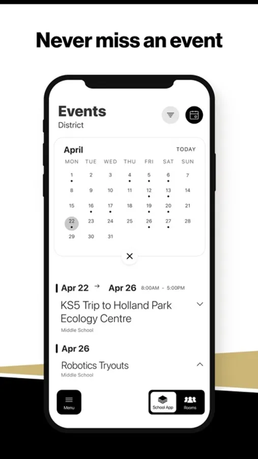 The event section shows a list of events throughout the district. Users can add an event to their calendar to share the event with friends and family with one tap.