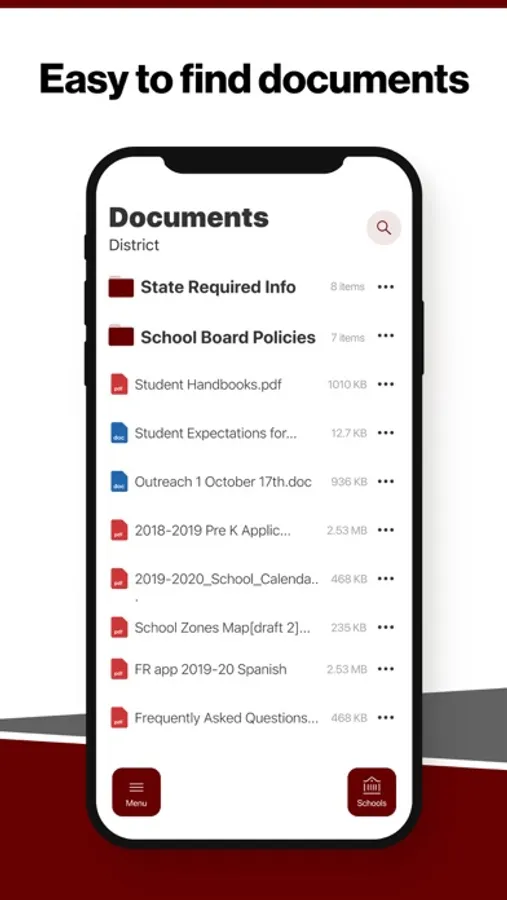 The event section shows a list of events throughout the district. Users can add an event to their calendar to share the event with friends and family with one tap.