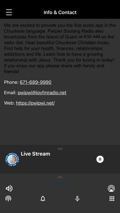 We are excited to provide you the first audio app in the Chuukese language. Pwipwi Soulang Radio also broadcasts from the Island of Guam at 630 AM on the radio dial. Hear beautiful Chuukese Christian music. Find help for your health, finances, relationships, addictions and life. Learn how to have a growing relationship with Jesus. Thank you for tuning in today! If you enjoy our app please share with family and friends!