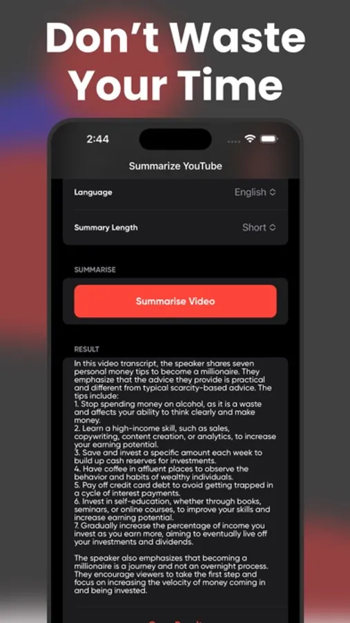 Harnessing the capabilities of advanced AI, our app creates these summaries, making it effortless for you to grasp the essence of lengthy videos in a fraction of the time. What's more, you can choose from a range of languages and summary lengths right within the app. Whether you're looking for a brief overview or an in-depth analysis, Summarizer for YouTube tailors the experience to your preferences.