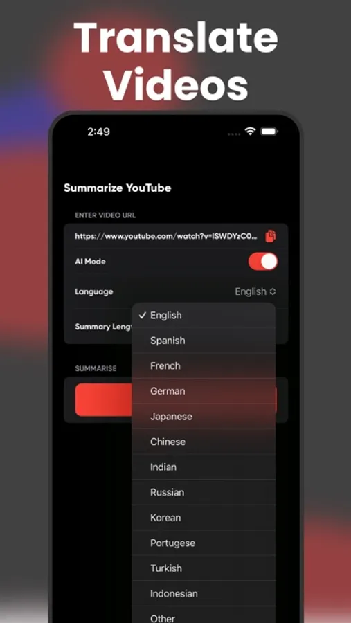 Empower yourself to explore content beyond language barriers. Switch between languages and discover the richness of global video content like never before. And with customizable summary lengths, you're in control of the level of detail you want.