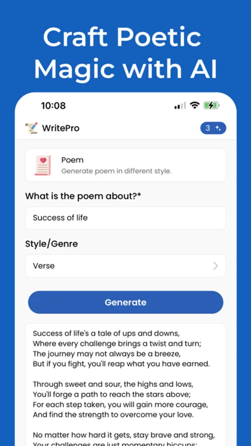 3. Poem Writing: Embrace the beauty of poetic expression with our intuitive interface. Whether it's sonnets, haikus, or free verse, let your emotions take flight as you create stunning poems.
