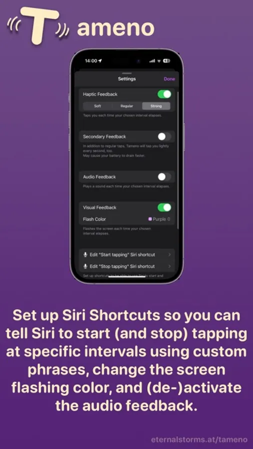 - Set an interval from 2 to 60 seconds and Tameno will make your device vibrate, play a sound and/or flash your screen each time the interval elapses.