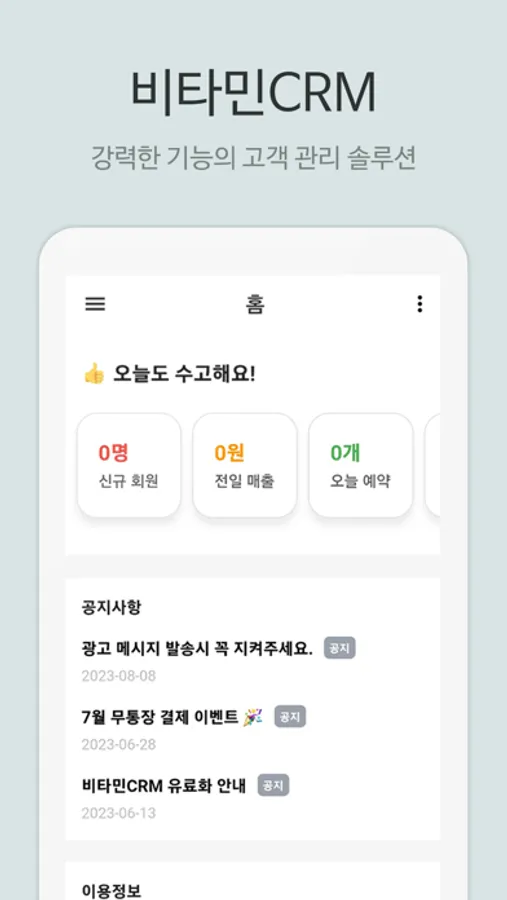 비타민CRM 고객관리 프로그램은 회원 정보 등록, 관리와 판매, 예약, 상담, 출석, 포인트의 기능을 제공합니다.
